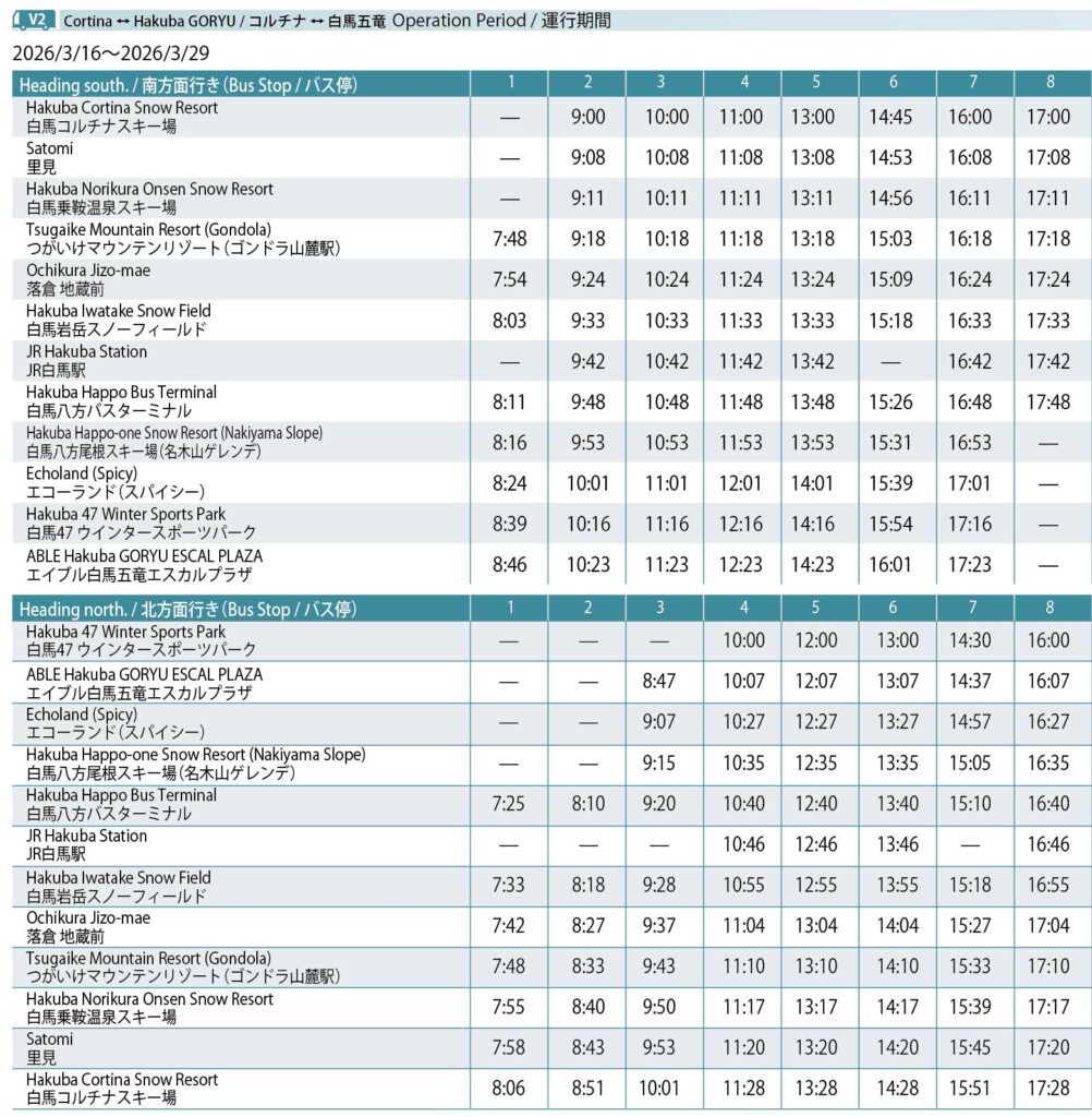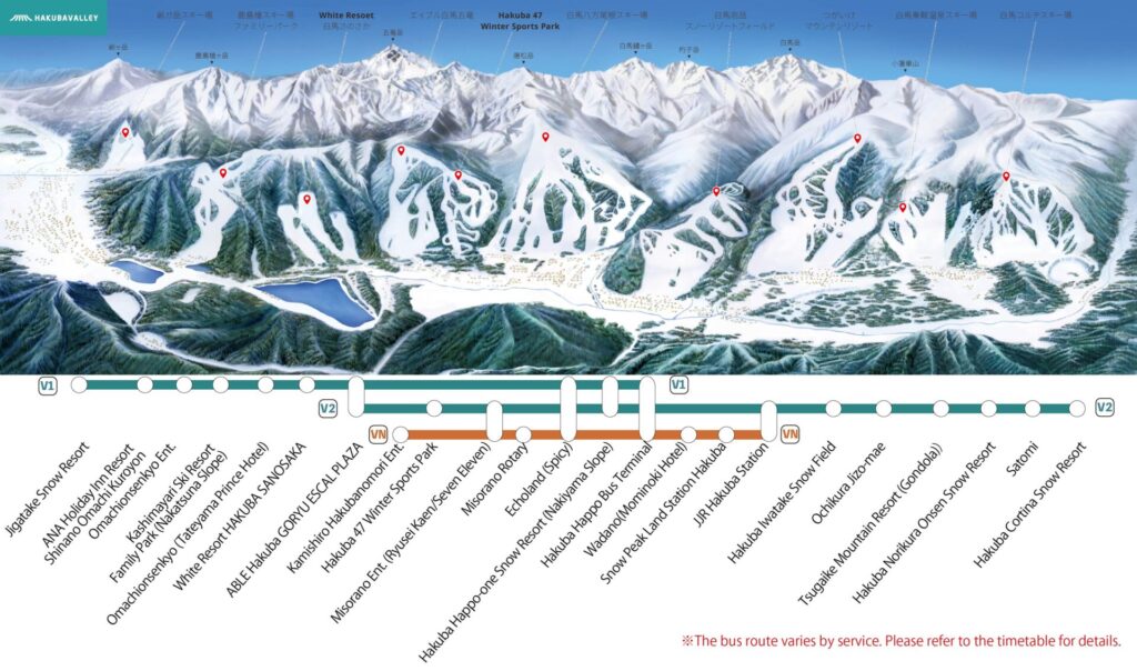 ●Depending on snowfall conditions, services may be extremely crowded. Please note that Hakuba Valley Shuttle buses cannot be boarded once they reach full capacity.