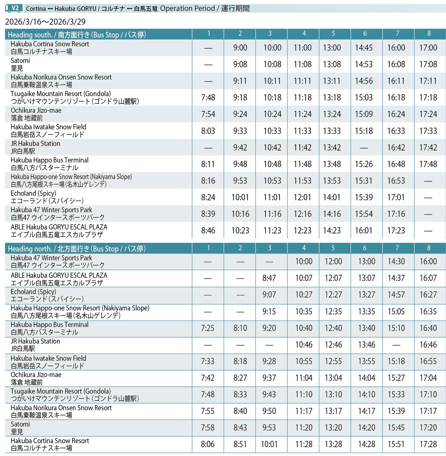 ●Depending on snowfall conditions, services may be extremely crowded. Please note that Hakuba Valley Shuttle buses cannot be boarded once they reach full capacity.