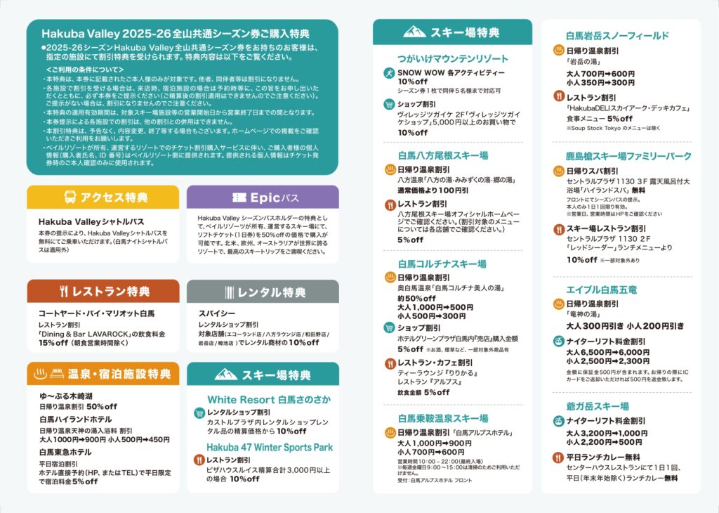 - 各施設で割引を受ける場合は、来店時、宿泊施設の場合は予約時等に、この旨をお申し出いただくと共に、必ず、2025-2026シーズンHakuba Valley 全山共通シーズン券をご提示ください。(会計支払い後の割引適用はできませんのでご注意ください) ご提示がない場合は、割引になりません。