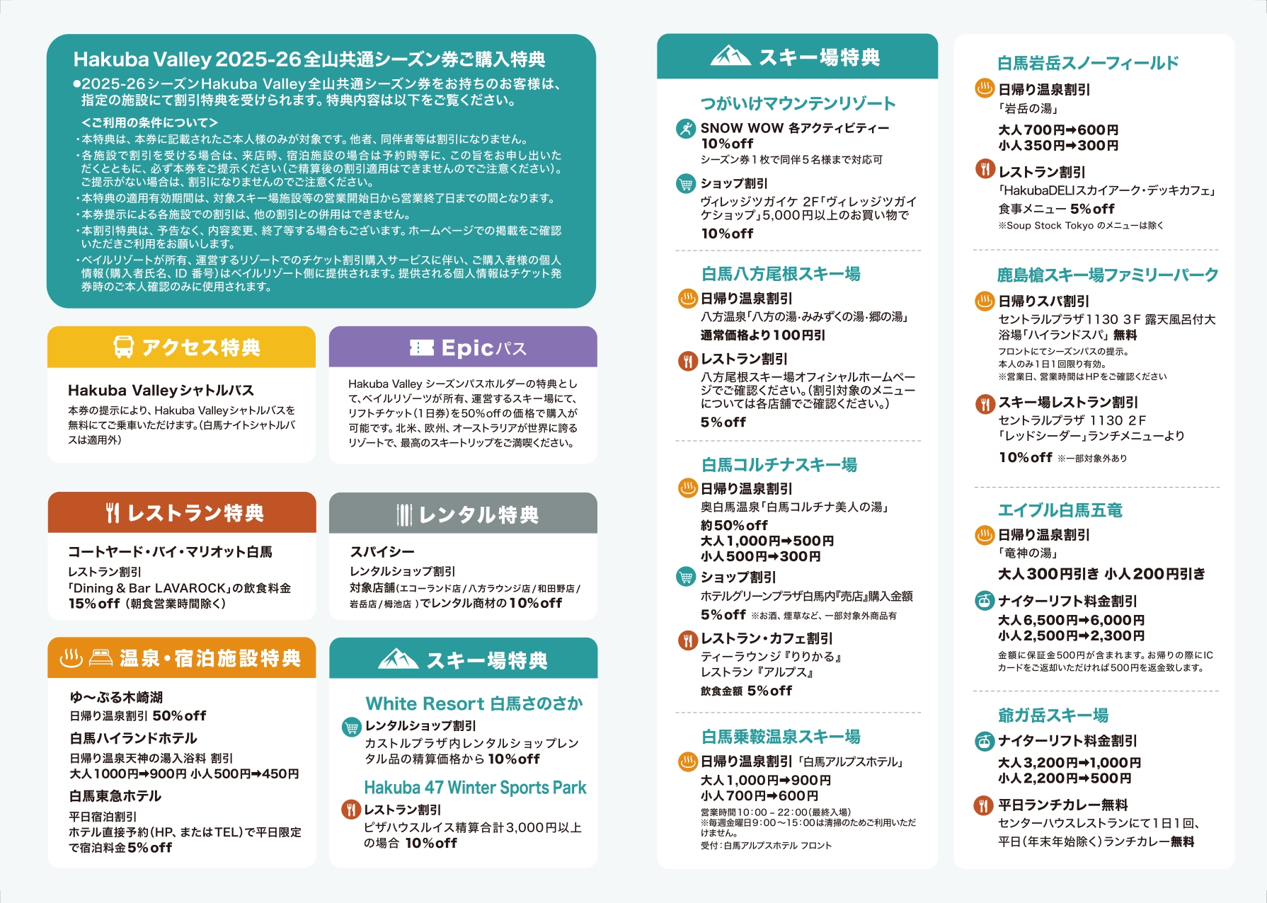 併設するホテルグリーンプラザ白馬は客室数253、エリア最大規模のホテルで温泉施設が充実しているのはもちろんのこと、リゾート内のレストランでは和食、イタリアン、ファストフードの食事メニューからスイーツ、カプチーノなどのカフェメニューまで豊富に取り揃えています。スキーの後の温泉は至福のひとときです。
